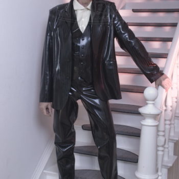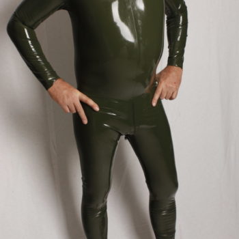 Klassisches Kurzarmhemd mit Reißverschluss. Der Kragen und alle Applikationen sind farbig abgesetzt und aus Latex in Kroko – Struktur gefertigt..